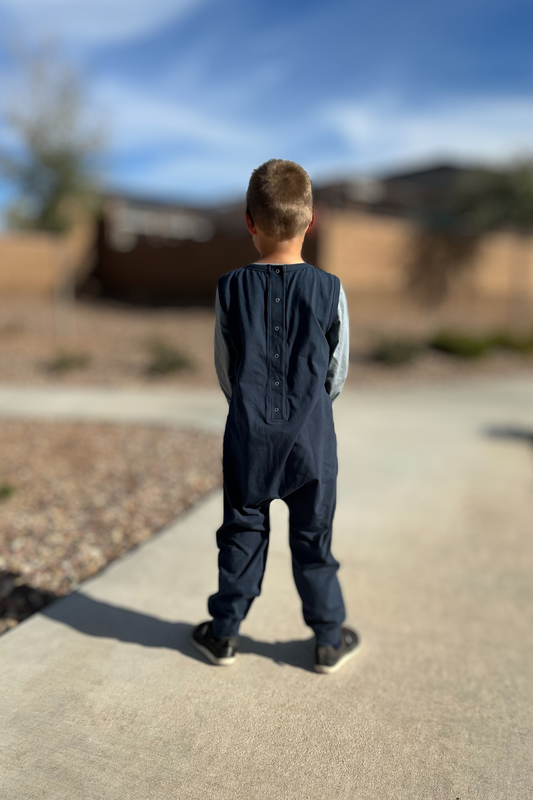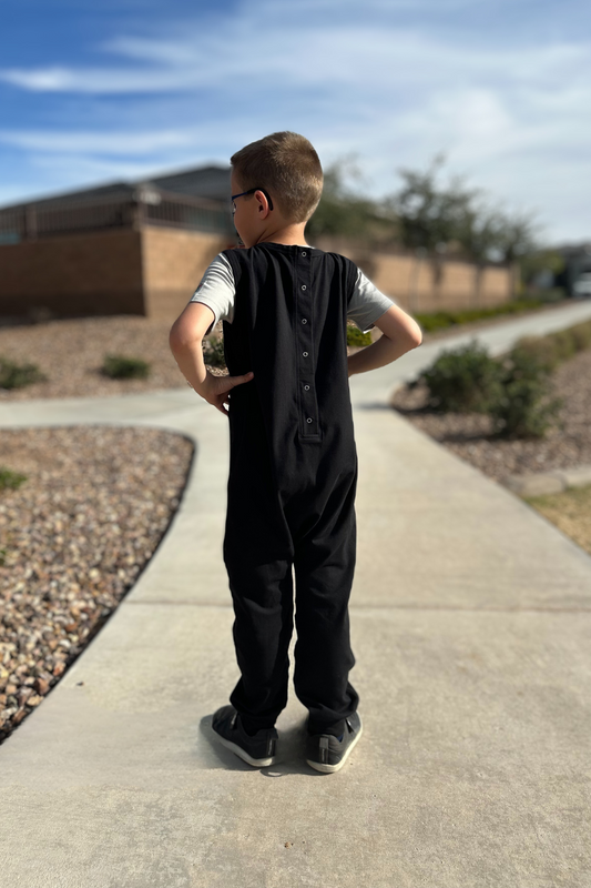 Our mindfully designed adaptive wear combines comfort with security. Made from soft organic cotton in small batches by responsible manufacturers in Bali, each piece features flat seams and tagless design for maximum sensory comfort. Our innovative layering system keeps your child partially dressed during care - wear a long or short sleeve shirt underneath the romper, so even during bathroom visits, they stay comfortable and covered. Available with or without built-in chewy holders, our rompers offer a thoughtful fit that's perfect for layering while maintaining security.